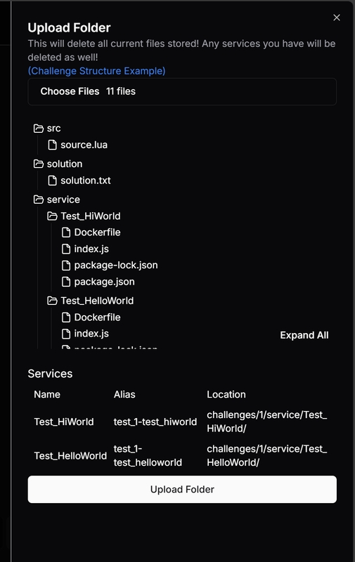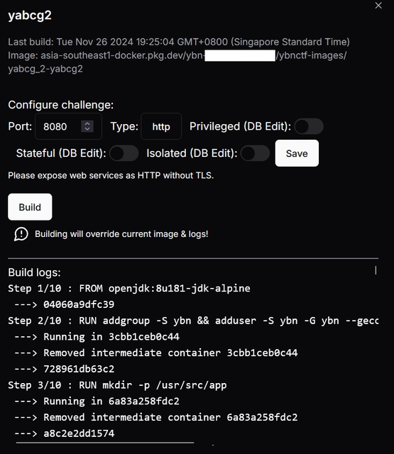 Each service is auto-detected from the contents they upload in the service directory. The challenge author can then configure port, type, and other options. Once satisfied, they can build an image, which uses Dockerode to build the image on a remote build machine (also on GCE) via the Docker remote API. Any logs (including errors) will be shown.