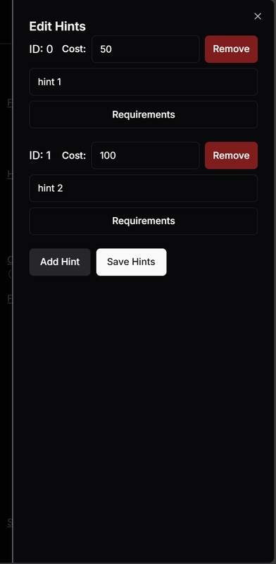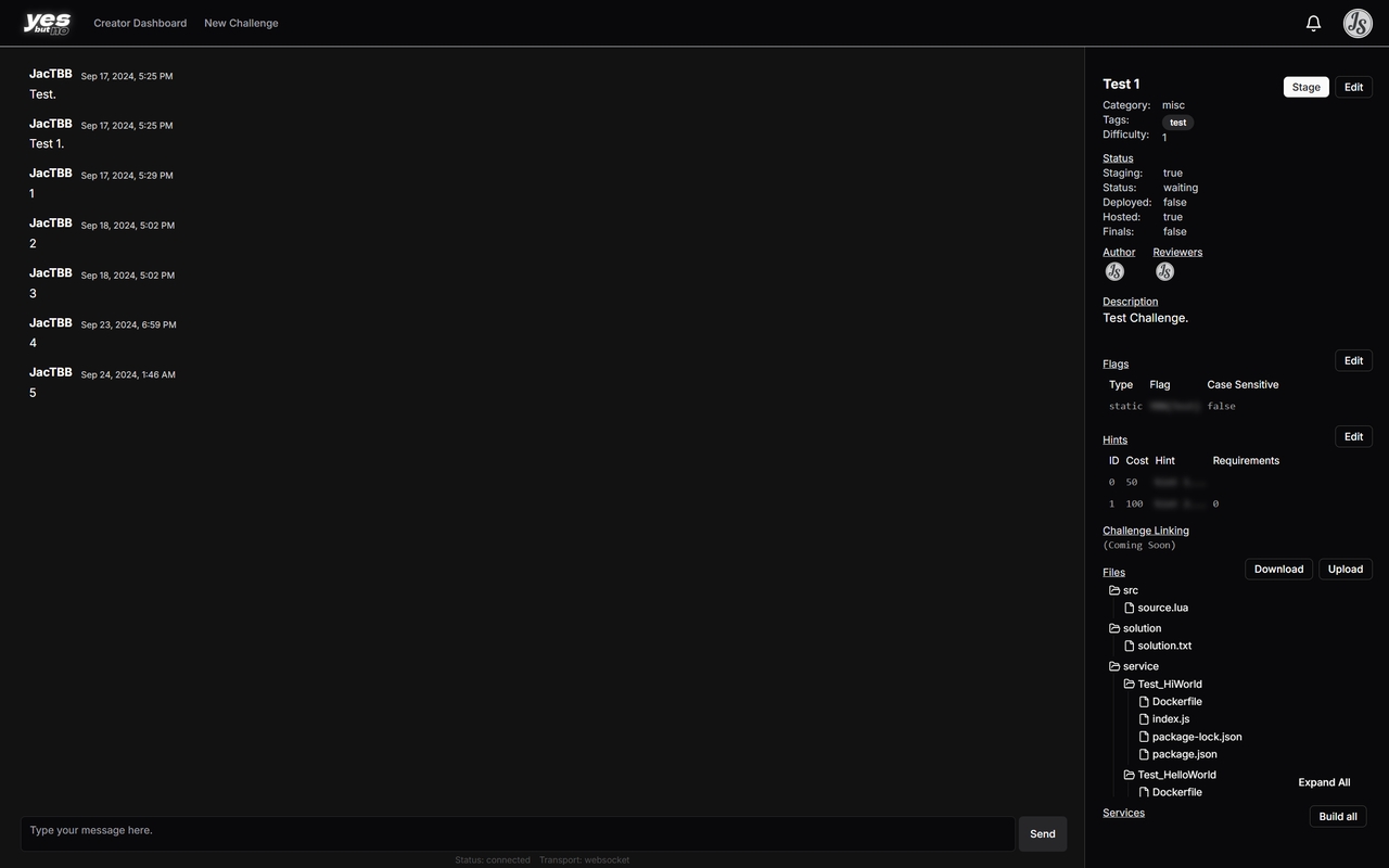 This is what the individual challenge page looks like. Featuring options to edit details, hints, flags, files & services. As well as challenge review status and a chat system to communicate with reviewers.