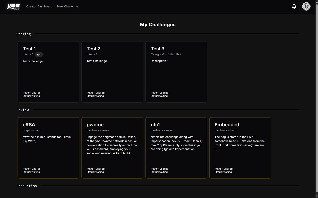 yCTF-A, inspired by CTF-A is similar but also significantly different. It is a whole challenge management platform on the web! Allowing authors to create unstaged work-in-progress challenges that allow us to get a sense of the number and type of challenges being made. Authors then upload challenge files & details and submit challenges for review. Multiple reviewers can review and update the status of challenges. Once a challenge has been approved and marked as production, it can be deployed to CTFd and Challenge Servers. This tool is still in continuous development and we might allow external usage of it soon!